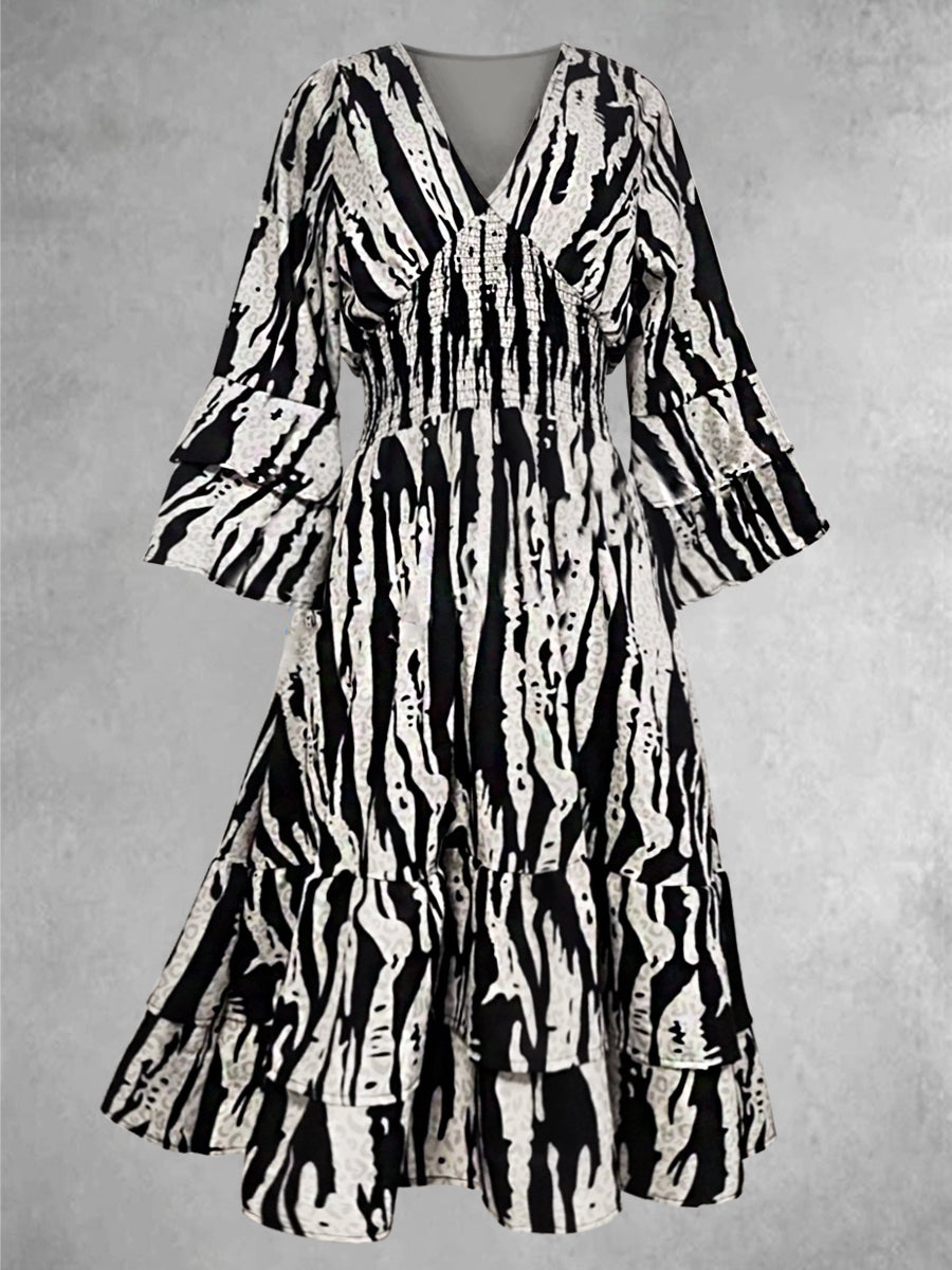 Retro glam virág művészet nyomtatás vintage elegáns v-nyak elasztikus derék többrétegű közepes hosszúságú ujjú midi ruha