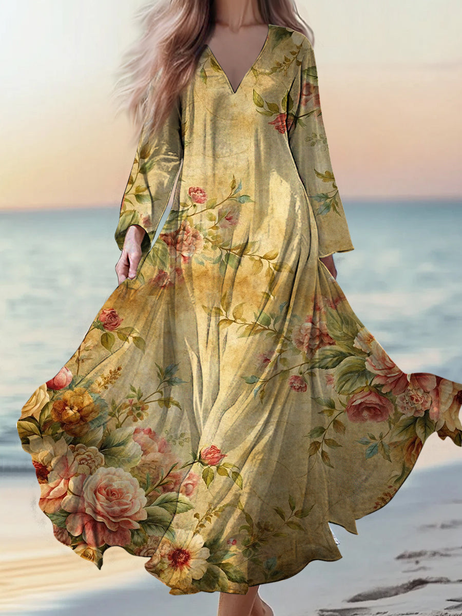 Retro boho virágos applique print vintage elegáns v-nyak pamut hosszú ujjú midi ruha