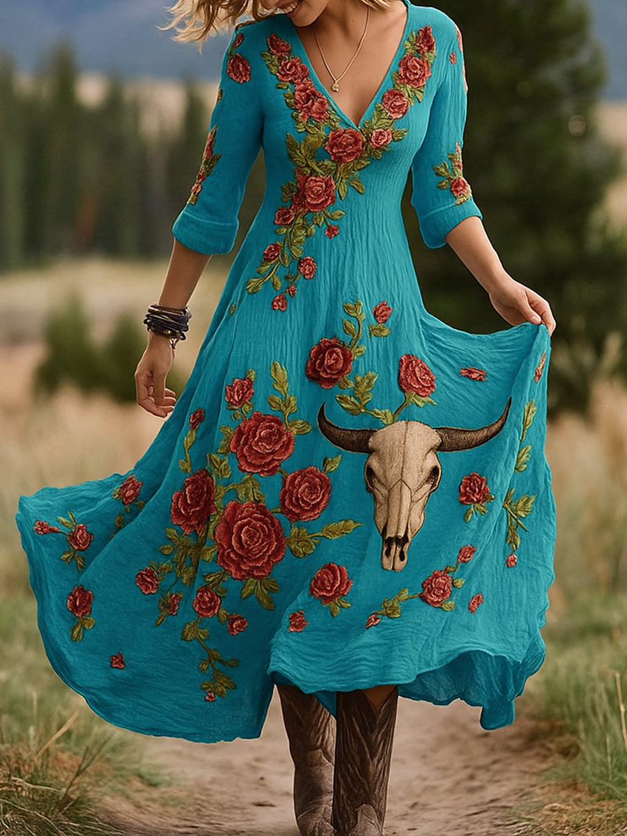 Retro virág művészet nyomtatás vintage v-nyak hosszú ujjú pamut maxi ruha