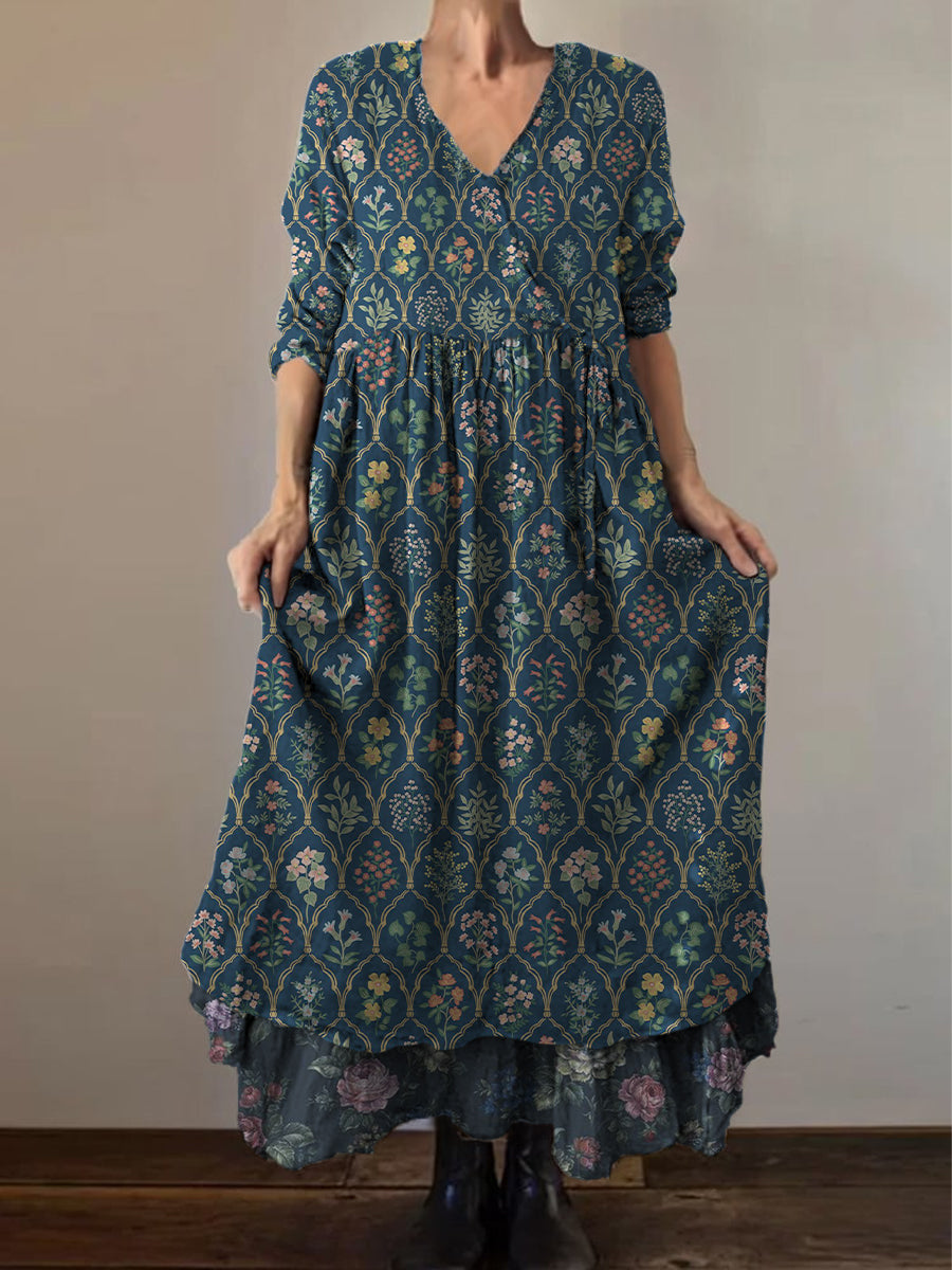 Retro boho virágos nyomtatás vintage v-nyak dupla hemline pamut hosszú ujjú midi ruha