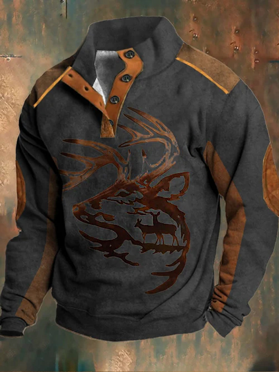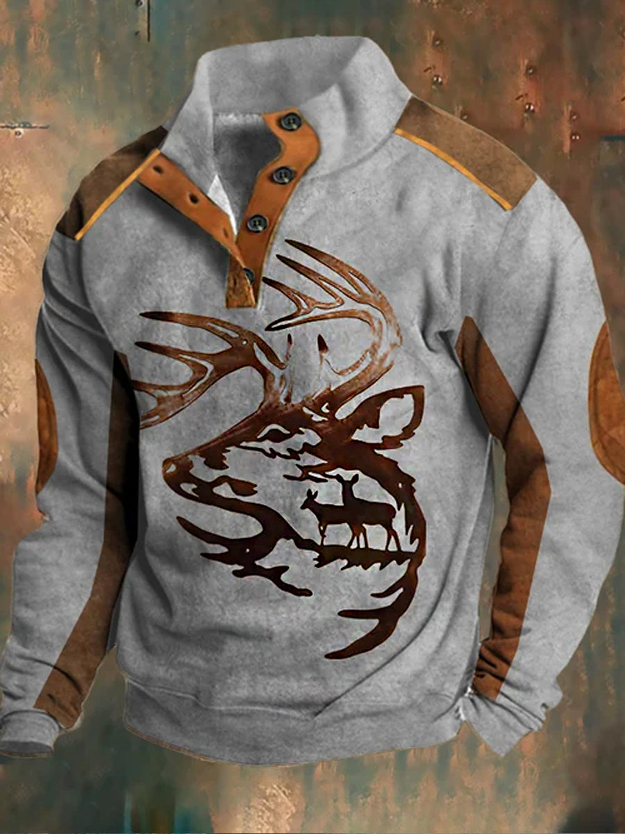 Férfi nyugati szarvas minta patchwork nyomtatás állvány gallér cipzár flush kültéri pulóver