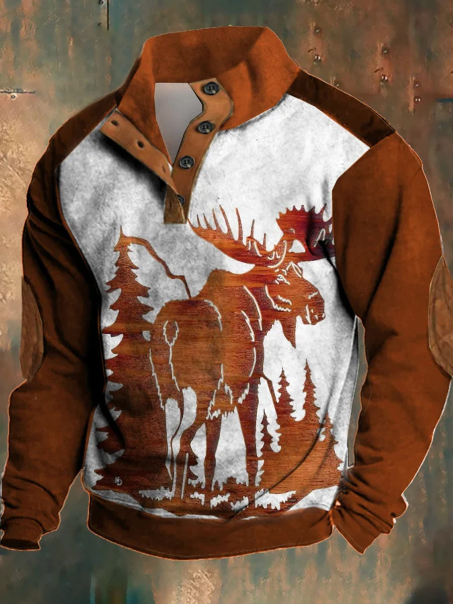 Férfi nyugati szarvas fa gabona nyomtatás állvány gallér cipzár flush kültéri pulóver