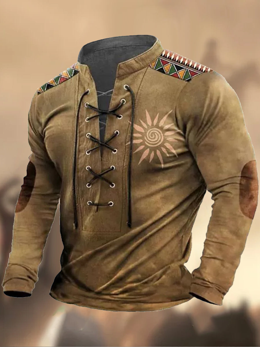Retro nyugati autópálya textúra minta nyomtatott falu v-nyak henry stílus hosszú ujjú ing