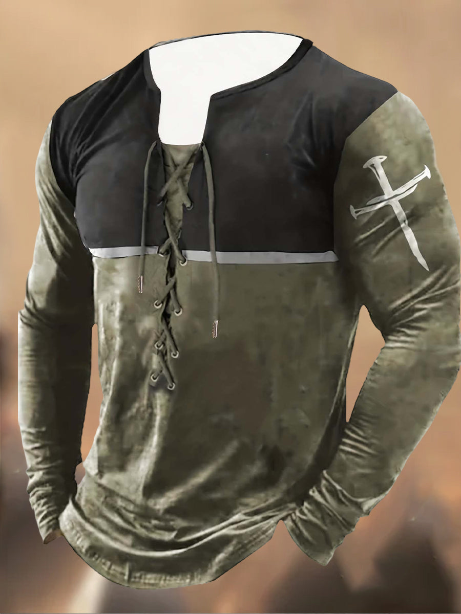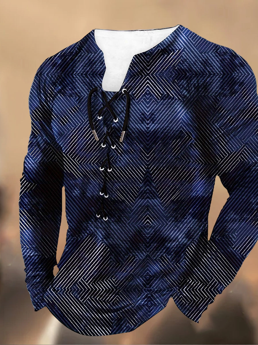 Férfi retro nyomtatás csipke-up csuklyás hosszú ujjú alkalmi felső