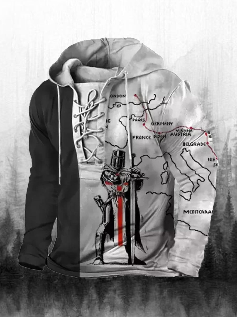 Férfi retro nyomtatás alkalmi hosszú ujjú csuklyás pulóver felső
