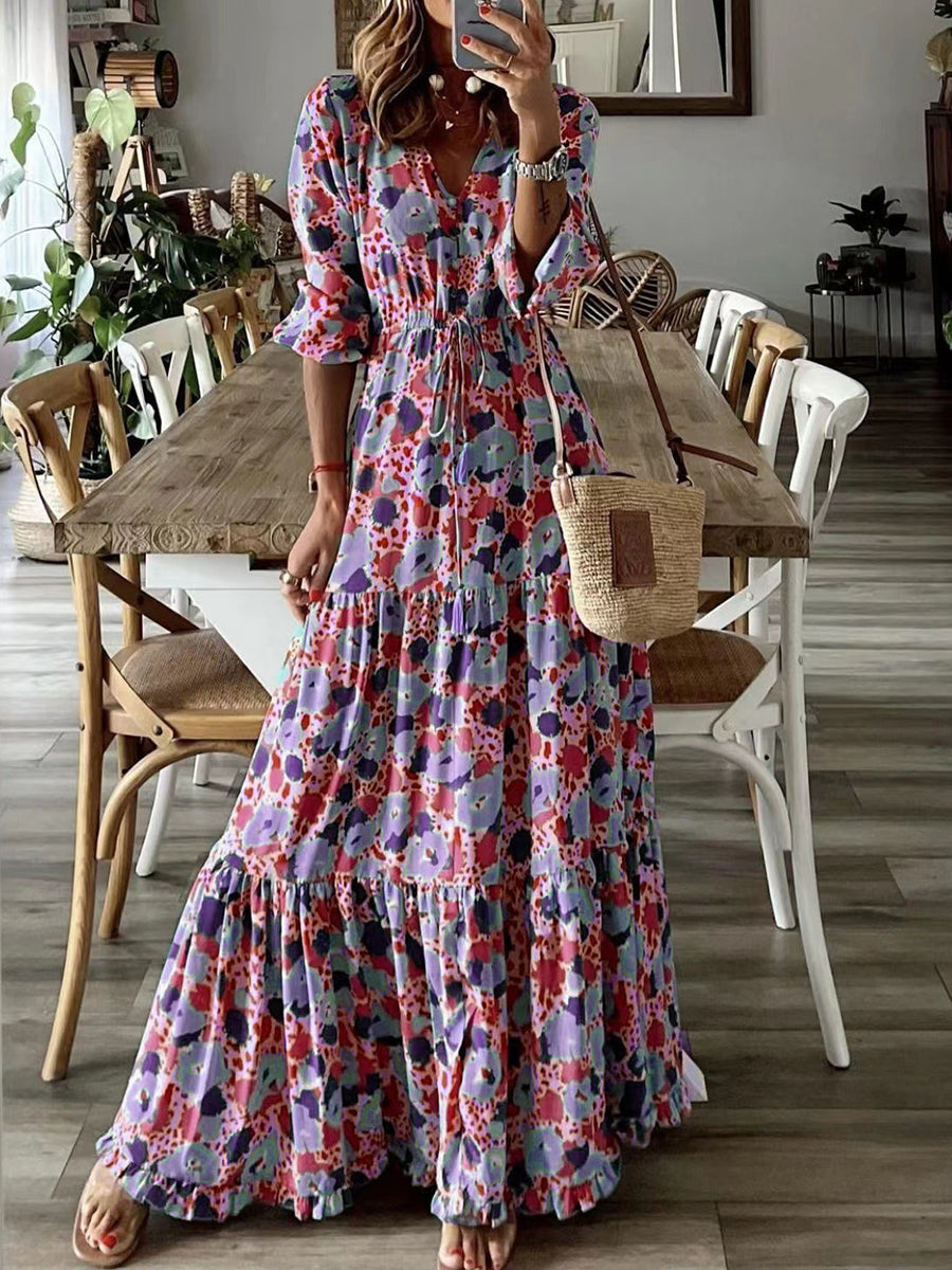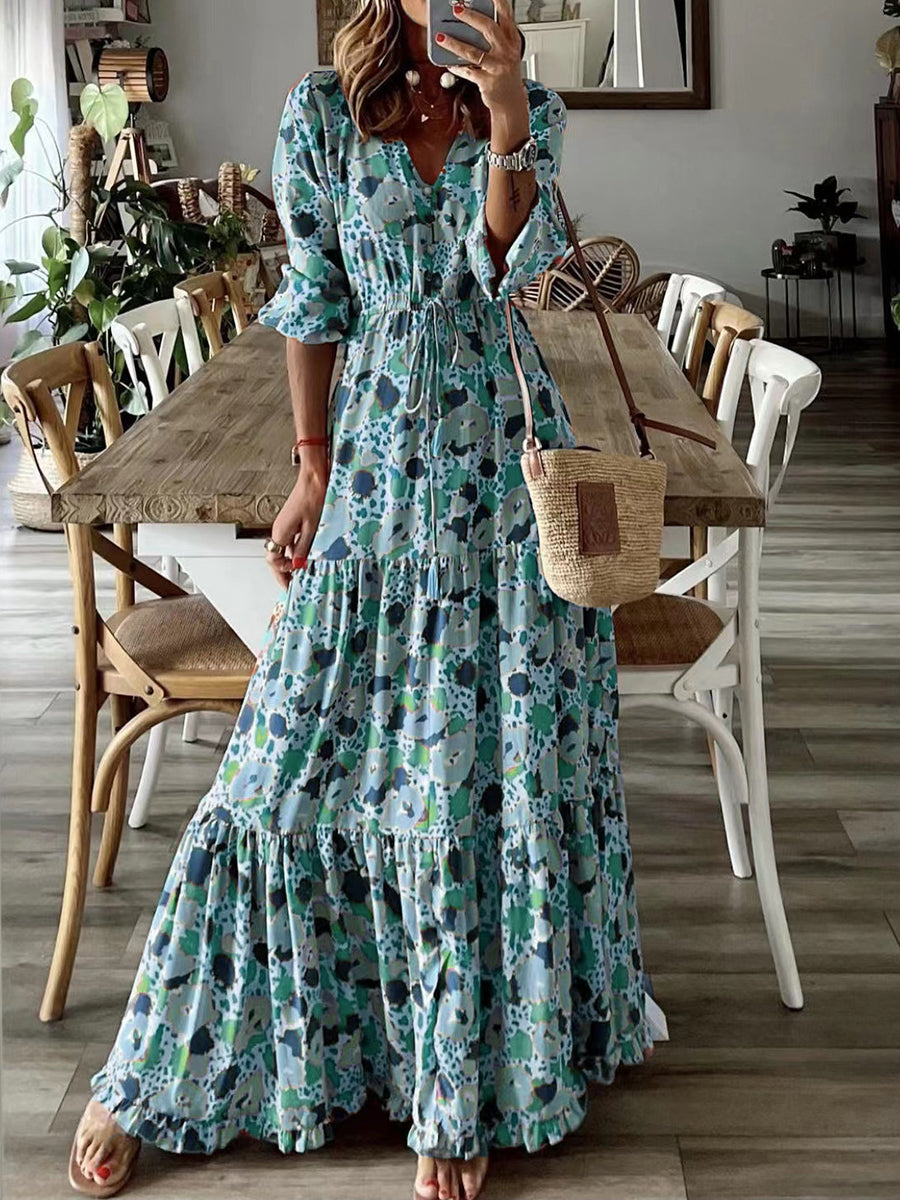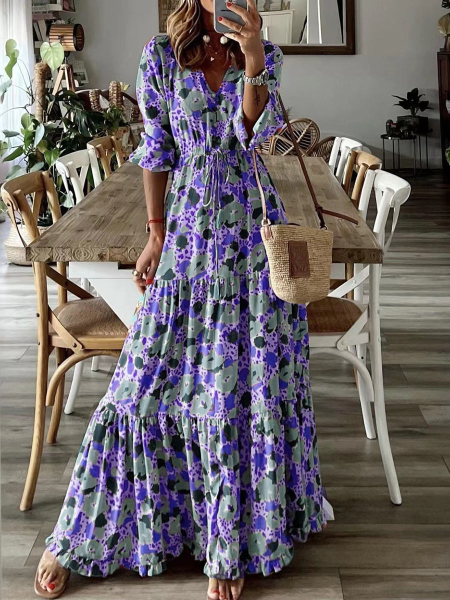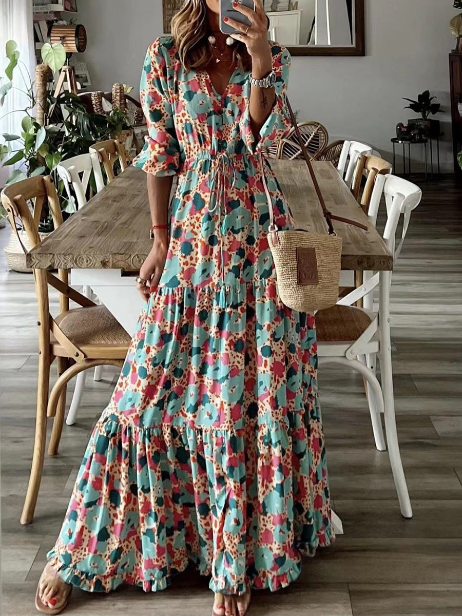 Női alkalmi v-nyak art print hosszú szegély ruha