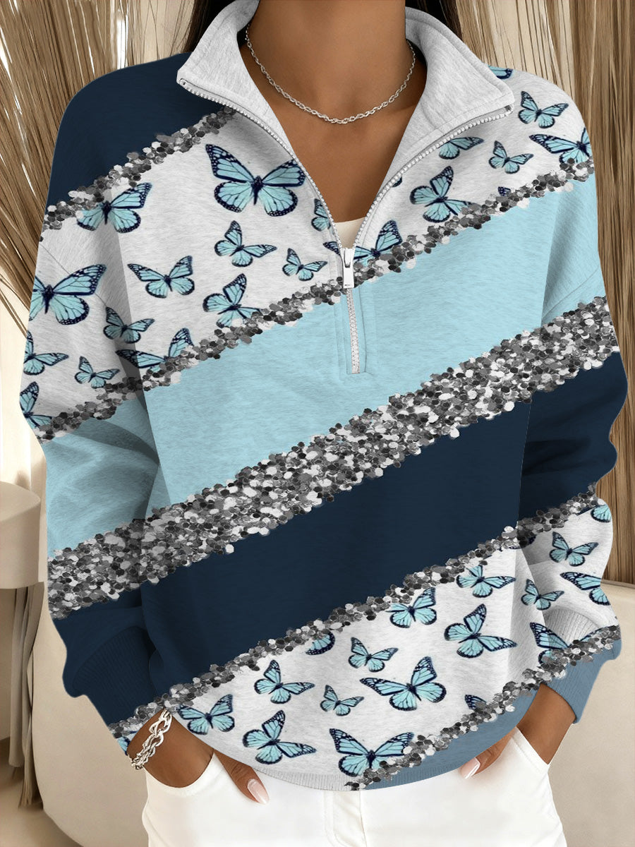 Női csillogó kék pillangó csíkos állvány-nyakörv pulóver