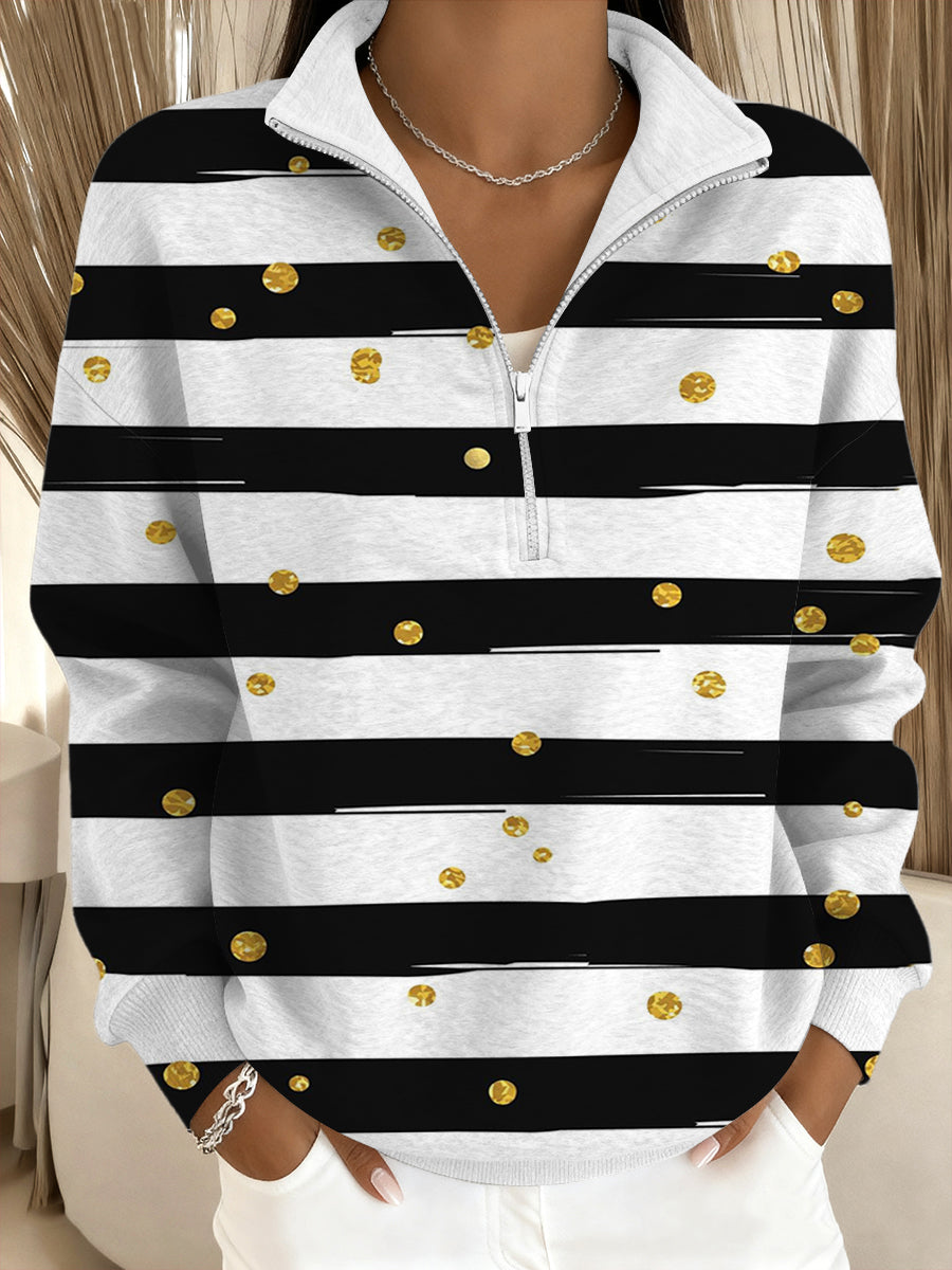 Női elbűvölő fekete-fehér csík & arany dot állvány-nyakörv pulóver