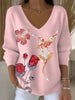 Női gyémánt madár és rózsa hímzett rózsaszín v-nyak pulóver