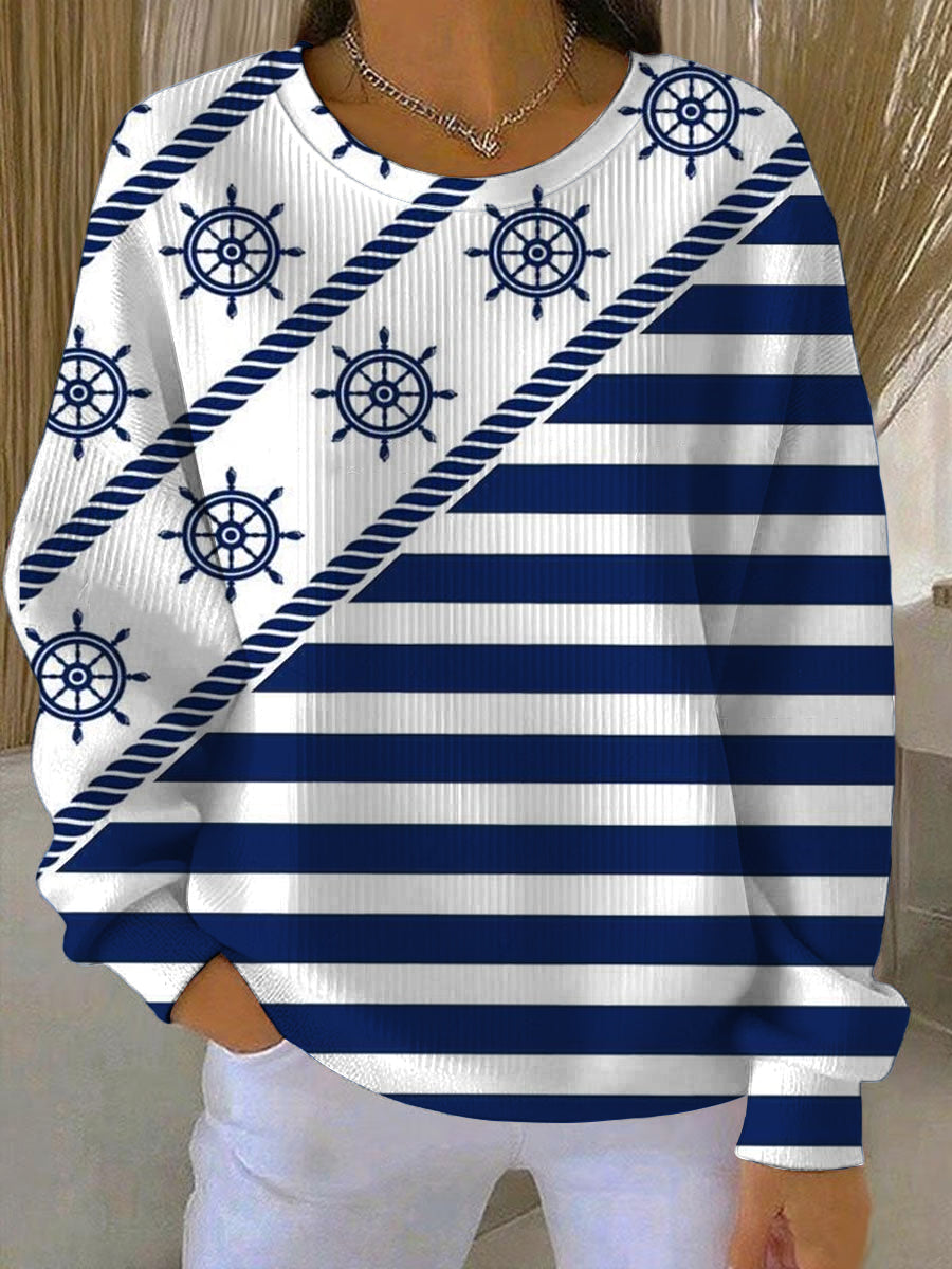 Női tengeri stílusú fehér és kék csíkos pulóver hajókerék mintákkal