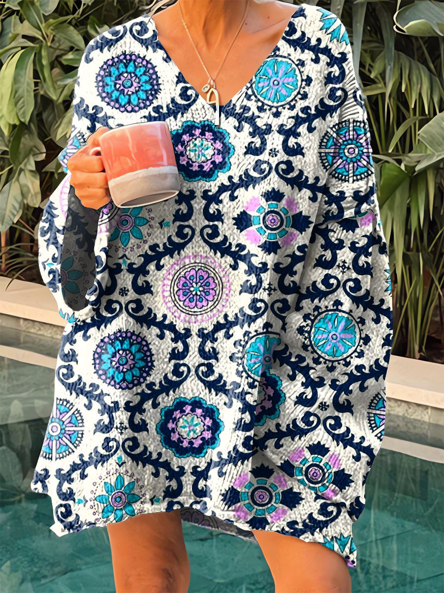 Női vintage etnikai geometriai nyomtatás v-nyak pulóver