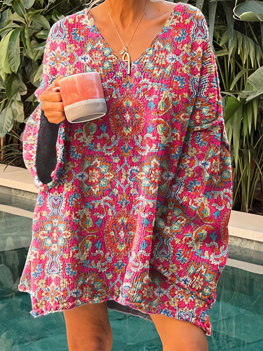Női vintage etnikai geometriai virágművészet nyomtatás v-nyak pulóver