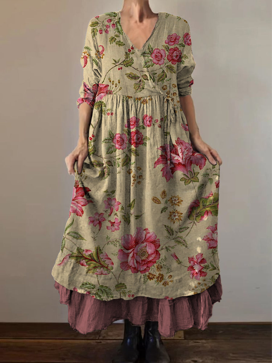 Retro boho virágos nyomtatás vintage v-nyak dupla hemline pamut hosszú ujjú midi ruha