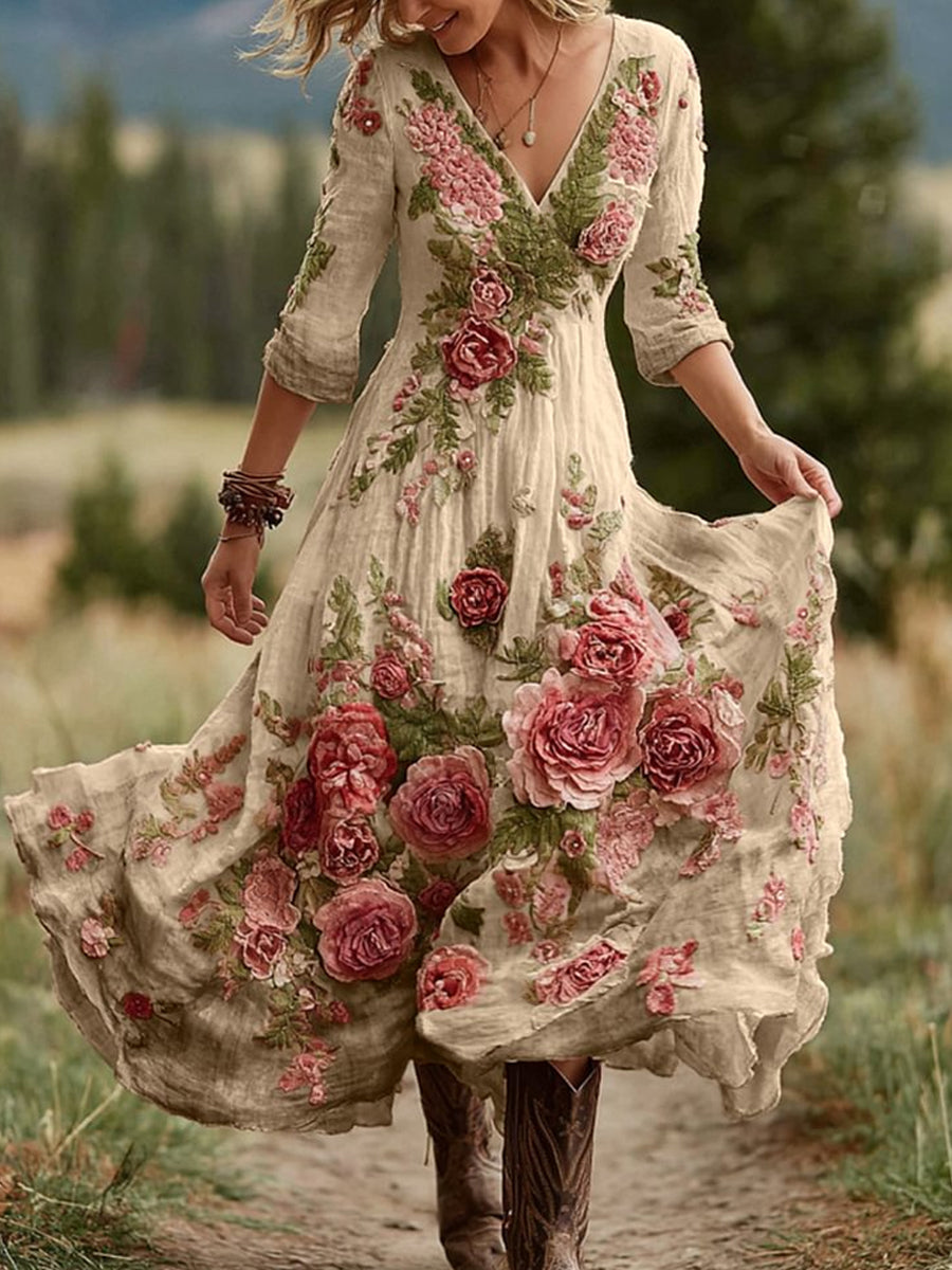 Retro virág művészet nyomtatás vintage v-nyak hosszú ujjú pamut maxi ruha