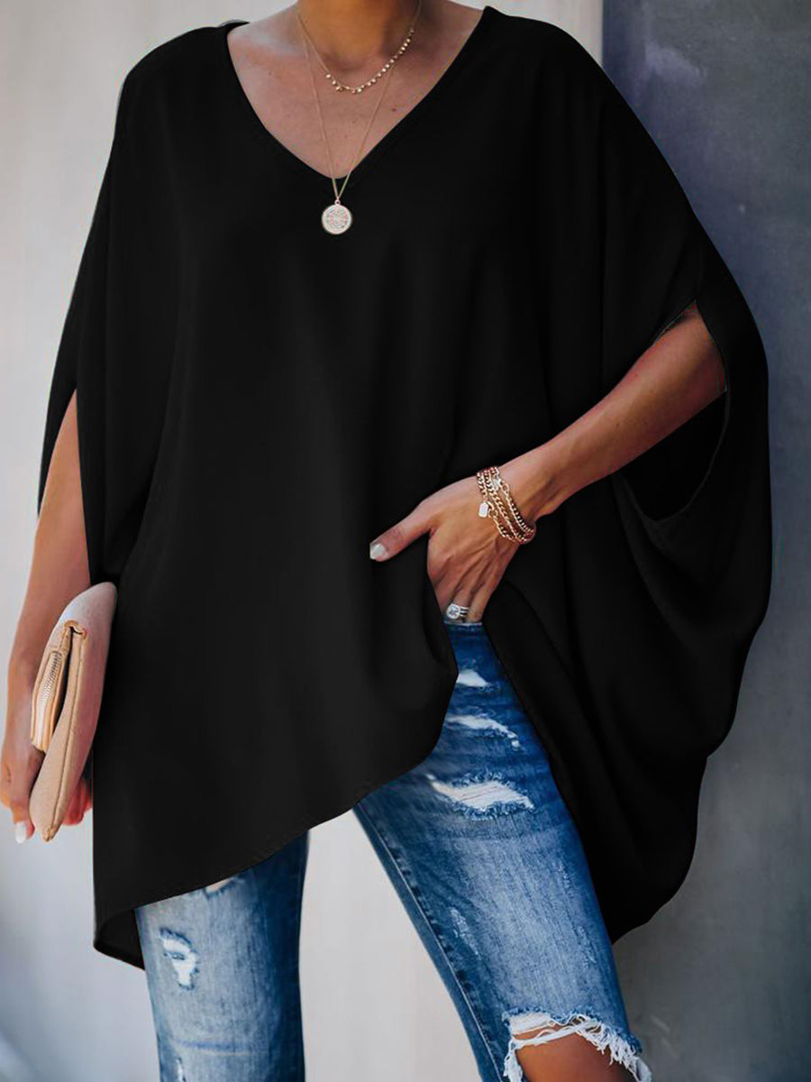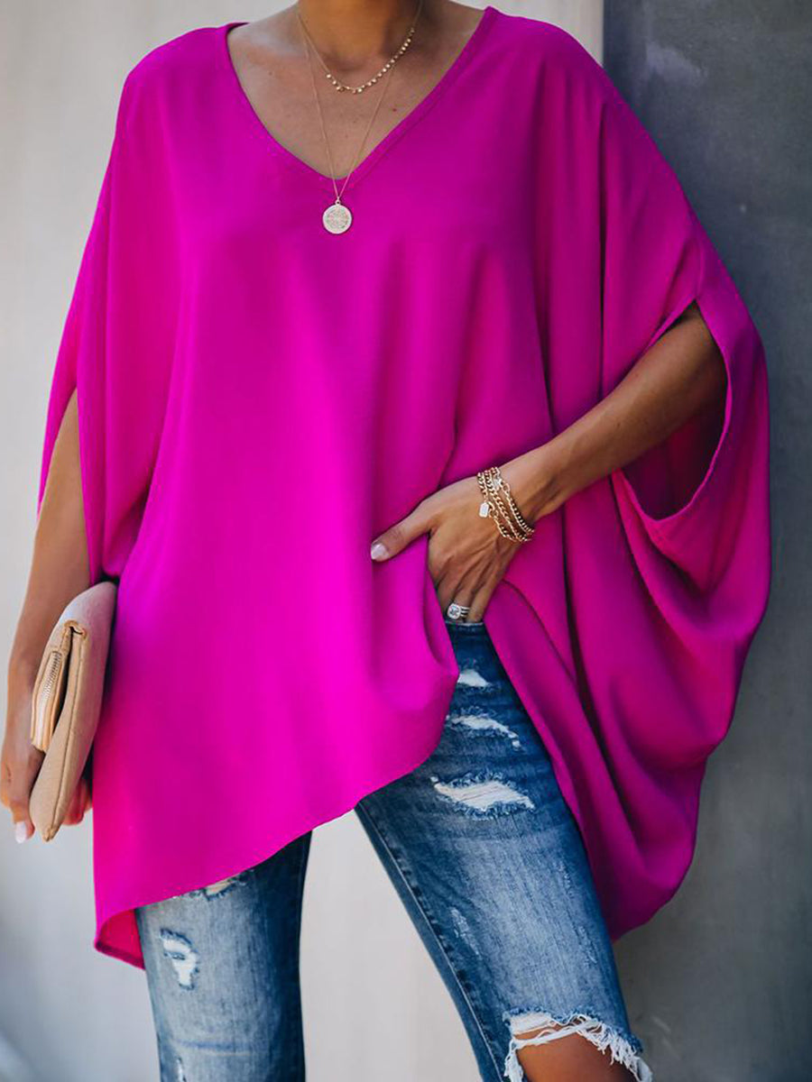 Női alkalmi egyszínű v-neck denevér ujjú póló nőknek