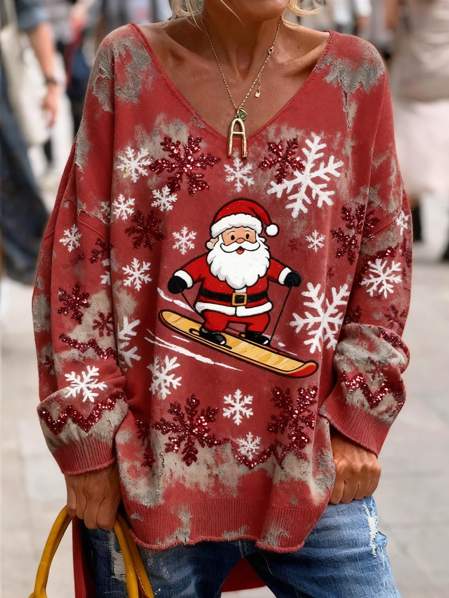 Női vintage karácsonyi művészet nyomtatás hangulatos kötött top