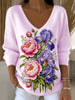 Női rózsaszín virágos hímzés v-nyak pulóver
