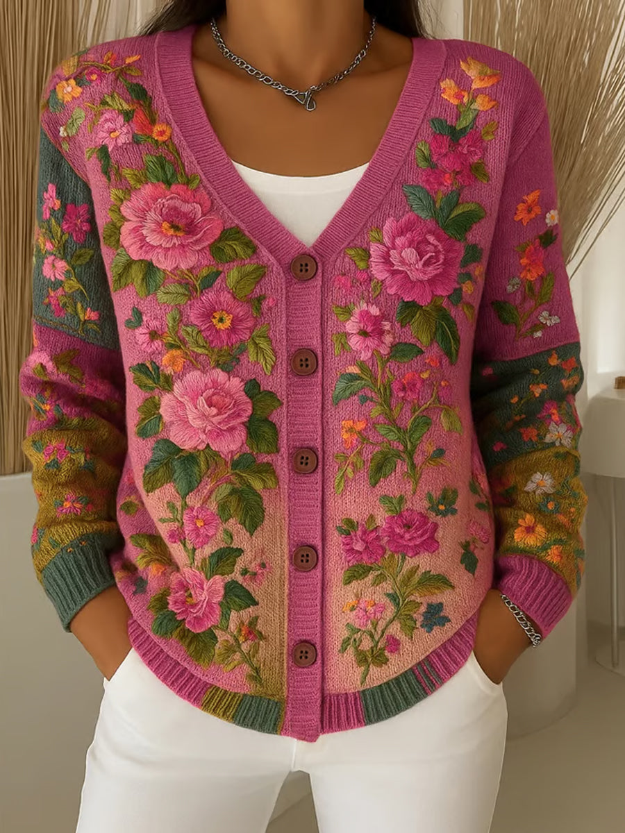 Női vintage virágos nyomtatás gomb kardigán
