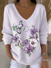 Női temperamentum lila virágos pillangó hímzés v-nyak pulóver