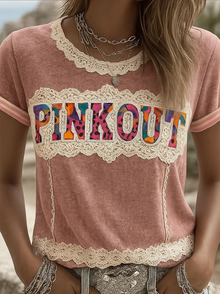 Női retro rózsaszín nyomtatás kényelmes alkalmi póló
